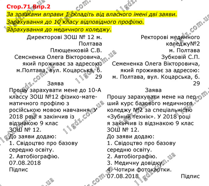 Впр.2 За зразками вправи 1 складіть від власного імені дві заяви. Зарахування до 10 класу відповідного профілю. Зарахування до медичного коледжу. Директорові ЗОШ № 12 м. Полтава Плющенковій С.В. Семсненка Олега Вікторовича, який проживає за адресою: м.Полтава, вул. Коцарська, б. 29 Заява Прошу зарахувати мене до 10-А классу ЗОШ №12 фізико-мате-матичного профілю з російською мовою навчання. У 2018 році я закінчив із відзнакою 9 клас ЗОШ № 12. До заяви додаю: 1. Свідоцтво про базову середню освіту. 2. Автобіографію. 07.08.2018 Підпис Ректорові медичного коледжу№2 м. Полтава Зубковій С.П. Семененка Олега Вікторовича, який проживає за адресою: м. Полтава, вул. Коцарська, б. 29 Заява Прошу зарахувати мене на пер-ший курс базового медичного коледжу №2 за спеціальністю «Зубний технік». У 2018 році я закінчив із відзнакою 9 клас ЗОШ № 12. До заяви додаю: 1. Свідоцтво про базову середню освіту. 2. Автобіографію. 3. Медичну довідку. 4. Чотири фотокартки. 07.08.2018 Підпис