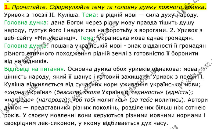 1. Прочитайте. Сформулюйте тему та головну думку кожного уривка. Уривок з поезії II. Куліша. Тема: в рідній мові — сила духу народу. Головна думка: дана Богом через рідну мову правда тішить душу народу, гуртує його і надає сил на боротьбу з ворогами. 2. Уривок з веб-сайту «Ми-українці». Тема: українська мова єднає громадян. Головна думка: пошана українській мові - знак відданості її громадян різного етнічного походження рідній землі з готовністю її боронити від нападників. Відповіді на питання. Основна думка обох уривків однакова: мова — цінність народу, який її шанує і готовий захищати. Уривок з поезії П. Куліша відхиляється від сучасних норм уживання української мови; «хирна Україна» (безсила, квола Україна); «єдиность» (єдність); «наградо» (нагорода); «об тобі молитись» (за тебе молитись). Автори думок — представники різних поколінь, розділених більш ніж сотнею років. У своєму мовленні вони керуються різними мовними нормами і своєрідним лексиконом, у якому відбивається дух часу.