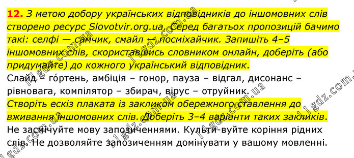 З метою добору українських відповідників до іншомовних слів створено ресурс Slovotvir.org.ua. Серед багатьох пропозицій бачимо такі: селфі — самчик, смайл — посміхайчик. Запишіть 4–5 іншомовних слів, скориставшись словником онлайн, доберіть (або придумайте) до кожного український відповідник. Слайд – го́ртень, амбіція – гонор, пауза – відгал, дисонанс – рівновага, компілятор – збирач, вірус – отруйник. Створіть ескіз плаката із закликом обережного ставлення до вживання іншомовних слів. Доберіть 3–4 варіанти таких закликів. Не засмічуйте мову запозиченнями. Культивуйте коріння рідних слів. Не дозволяйте запозиченням домінувати у вашому мовленні.