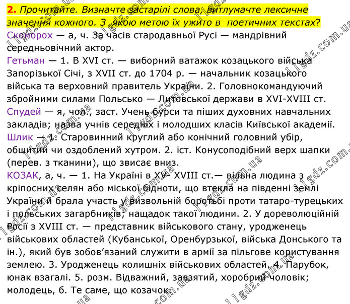 2. Прочитайте. Визначте застарілі слова, витлумачте лексичне значення кожного. З якою метою їх ужито в поетичних текстах? Скоморох — а, ч. За часів стародавньої Русі — мандрівний середньовічний актор. Гетьман — 1. В XVI ст. — виборний ватажок козацького війська Запорізької Січі, з XVII ст. до 1704 р. — начальник козацького війська та верховний правитель України. 2. Головнокомандуючий збройними силами Польсько — Литовської держави в ХVІ-ХVІII ст. Спудей — я, чол., заст. Учень бурси та піших духовних навчальних закладів; назва учнів середніх і молодших класів Київської академії. Шлик — 1. Старовинний круглий або конічний головний убір, обшитий чи оздоблений хутром. 2. іст. Конусоподібний верх шапки (перев. з тканини), що звисає вниз. КОЗАК, а, ч. — 1. На Україні в XV- XVIII ст.— вільна людина з кріпосних селян або міської бідноти, що втекла на південні землі України й брала участь у визвольній боротьбі проти татаро-турецьких і польських загарбників; нащадок такої людини. 2. У дореволюційній Росії з XVIII ст. — представник військового стану, уродженець військових областей (Кубанської, Оренбурзької, війська Донського та ін.), який був зобов’язаний служити в армії за пільгове користування землею. 3. Уродженець колишніх військових областей. 4. Парубок, юнак взагалі. 5. розм. Відважний, завзятий, хоробрий чоловік; молодець, б. Те саме, що козачок.