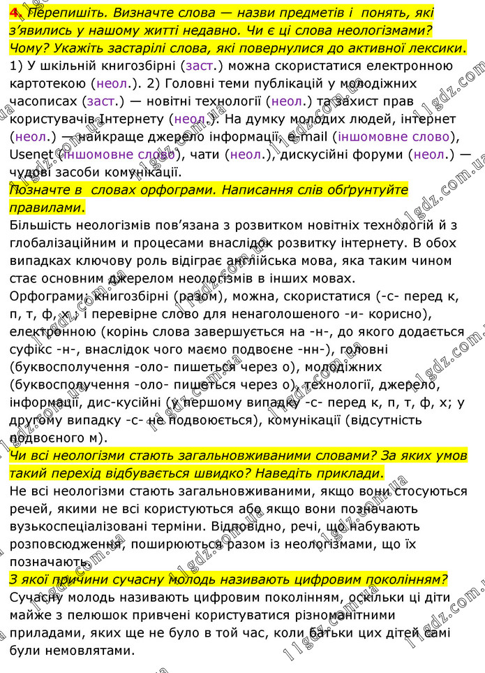 Перепишіть. Визначте слова — назви предметів і понять, які з’явились у нашому житті недавно. Чи є ці слова неологізмами? Чому? Укажіть застарілі слова, які повернулися до активної лексики. 1) У шкільній книгозбірні (заст.) можна скористатися електронною картотекою (неол.). 2) Головні теми публікацій у молодіжних часописах (заст.) — новітні технології (неол.) та захист прав користувачів Інтернету (неол.). На думку молодих людей, інтернет (неол.) — найкраще джерело інформації, e-mail (іншомовне слово), Usenet (іншомовне слово), чати (неол.), дискусійні форуми (неол.) — чудові засоби комунікації. Позначте в словах орфограми. Написання слів обґрунтуйте правилами. Більшість неологізмів пов’язана з розвитком новітніх технологій й з глобалізаційним и процесами внаслідок розвитку інтернету. В обох випадках ключову роль відіграє англійська мова, яка таким чином стає основним джерелом неологізмів в інших мовах. Орфограми; книгозбірні (разом), можна, скористатися (-с- перед к, п, т, ф, х ; і перевірне слово для ненаголошеного -и- корисно), електронною (корінь слова завершується на -н-, до якого додається суфікс -н-, внаслідок чого маємо подвоєне -нн-), головні (буквосполучення -оло- пишеться через о), молодіжних (буквосполучення -оло- пишеться через о), технології, джерело, інформації, дискусійні (у першому випадку -с- перед к, п, т, ф, х; у другому випадку -с- не подвоюється), комунікації (відсутність подвоєного м). Чи всі неологізми стають загальновживаними словами? За яких умов такий перехід відбувається швидко? Наведіть приклади. Не всі неологізми стають загальновживаними, якщо вони стосуються речей, якими не всі користуються або якщо вони позначають вузькоспеціалізовані терміни. Відповідно, речі, що набувають розповсюдження, поширюються разом із неологізмами, що їх позначають. З якої причини сучасну молодь називають цифровим поколінням? Сучасну молодь називають цифровим поколінням, оскільки ці діти майже з пелюшок привчені користуватися різноманітними приладами, яких ще не було в той час, коли батьки цих дітей самі були немовлятами.