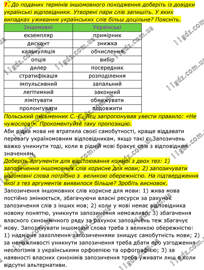 До поданих термінів іншомовного походження доберіть із довідки українські відповідники. Утворені пари слів запишіть. У яких випадках уживання українських слів більш доцільне? Поясніть. Іншомовні Українські екземпляр примірник дисконт знижка калькуляція обчислення опція вибір дилер посередник стратифікація розподілення імпульсивний запальний легітимний законний лімітувати обмежувати пролонгувати подовжити Польський письменник С.-Є. Лєц запропонував увести правило: «Не чужослов!». Прокоментуйте таку пропозицію. Аби рідна мова не втратила своєї самобутності, краще віддавати перевагу україномовним відповідникам, якщо такі є. Запозичень важко уникнути тоді, коли в рідній мові бракує слів з відповідним значенням. Доберіть аргументи для відстоювання кожної з двох тез: 1) запозичення іншомовних слів корисне для мови; 2) запозичувати іншомовні слова потрібно з великою обережністю. На підтвердження якої з тез аргументів виявилося більше? Зробіть висновок. Запозичення іншомовних слів корисне для мови: 1) жива мова постійно змінюється, збагачуючи власні ресурси за рахунок запозичення слів з інших мов; 2) коли у мові немає відповідника новому поняттю, уникнути запозичення неможливо; 3) збагачення власного синонімічного ряду за рахунок запозичень теж збагачує мову. Запозичувати іншомовні слова треба з великою обережністю: 1) надмірне захоплення запозиченнями знищує самобутність мови; 2) за неможливості уникнути запозичення треба дбати про узгодження неологізмів з українськими орфоепією та орфографією; 3) за наявності власних синонімів запозичення треба уживати лиш е коли відсутні альтернативи.