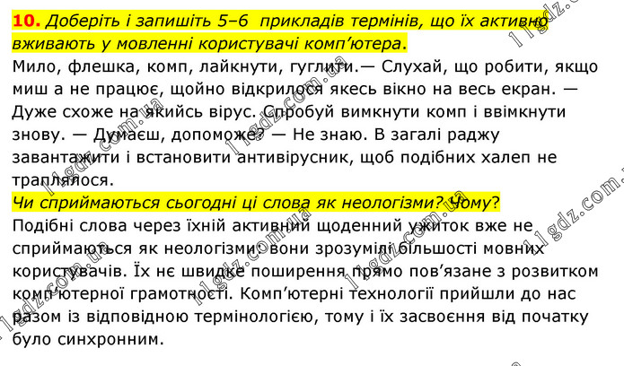 Доберіть і запишіть 5–6 прикладів термінів, що їх активно вживають у мовленні користувачі комп’ютера. Мило, флешка, комп, лайкнути, гуглити.— Слухай, що робити, якщо миш а не працює, щойно відкрилося якесь вікно на весь екран. — Дуже схоже на якийсь вірус. Спробуй вимкнути комп і ввімкнути знову. — Думаєш, допоможе? — Не знаю. В загалі раджу завантажити і встановити антивірусник, щоб подібних халеп не траплялося. Чи сприймаються сьогодні ці слова як неологізми? Чому? Подібні слова через їхній активний щоденний ужиток вже не сприймаються як неологізми: вони зрозумілі більшості мовних користувачів. Їх нє швидке поширення прямо пов’язане з розвитком комп’ютерної грамотності. Комп’ютерні технології прийшли до нас разом із відповідною термінологією, тому і їх засвоєння від початку було синхронним.