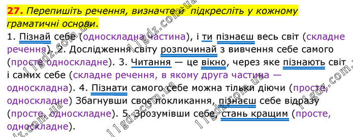 Перепишіть речення, визначте й підкресліть у кожному граматичні основи. 1. Пізнай себе (односкладна частина), і ти пізнаєш весь світ (складне речення). 2. Дослідження світу розпочинай з вивчення себе самого (просте односкладне). 3. Читання — це вікно, через яке пізнають світ і самих себе (складне речення, в якому друга частина — односкладна). 4. Пізнати самого себе можна тільки діючи (просте, односкладне) Збагнувши своє покликання, пізнаєш себе відразу (просте, односкладне). 5. Зрозумівши себе, стань кращим (просте, односкладне).