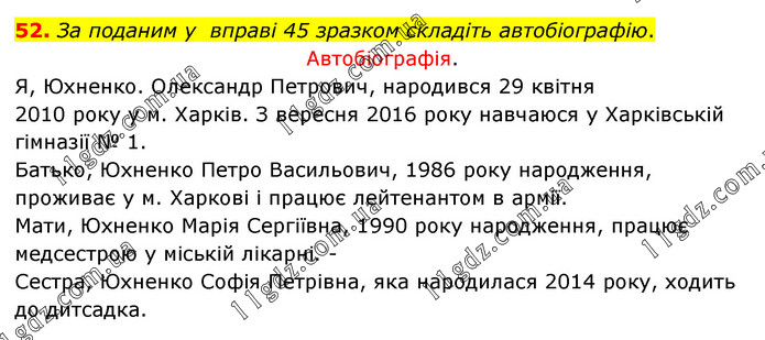 За поданим у вправі 45 зразком складіть автобіографію. Автобіографія. Я, Юхненко. Олександр Петрович, народився 29 квітня 2010 року у м. Харків. З вересня 2016 року навчаюся у Харківській гімназії № 1. Батько, Юхненко Петро Васильович, 1986 року народження, проживає у м. Харкові і працює лейтенантом в армії. Мати, Юхненко Марія Сергіївна, 1990 року народження, працює медсестрою у міській лікарні. - Сестра, Юхненко Софія Петрівна, яка народилася 2014 року, ходить до дитсадка.