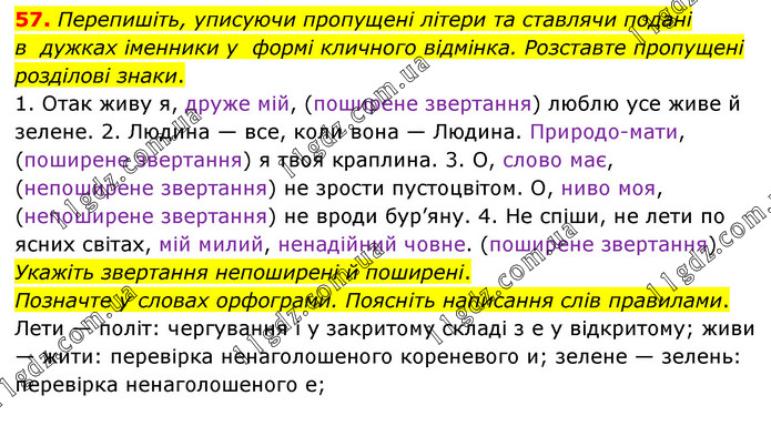 Перепишіть, уписуючи пропущені літери та ставлячи подані в дужках іменники у формі кличного відмінка. Розставте пропущені розділові знаки. 1. Отак живу я, друже мій, (поширене звертання) люблю усе живе й зелене. 2. Людина — все, коли вона — Людина. Природо-мати, (поширене звертання) я твоя краплина. 3. О, слово має, (непоширене звертання) не зрости пустоцвітом. О, ниво моя, (непоширене звертання) не вроди бур’яну. 4. Не спіши, не лети по ясних світах, мій милий, ненадійний човне. (поширене звертання) Укажіть звертання непоширені й поширені. Позначте у словах орфограми. Поясніть написання слів правилами. Лети — політ: чергування і у закритому складі з е у відкритому; живи — жити: перевірка ненаголошеного кореневого и; зелене — зелень: перевірка ненаголошеного е;