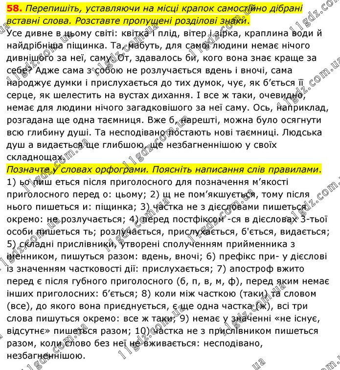 Перепишіть, уставляючи на місці крапок самостійно дібрані вставні слова. Розставте пропущені розділові знаки. Усе дивне в цьому світі: квітка і плід, вітер і зірка, краплина води й найдрібніша піщинка. Та, мабуть, для самої людини немає нічого дивнішого за неї, саму. От, здавалось би, кого вона знає краще за себе? Адже сама з собою не розлучається вдень і вночі, сама народжує думки і прислухається до тих думок, чує, як б’ється її серце, як шелестить на вустах дихання. І все ж таки, очевидно, немає для людини нічого загадковішого за неї саму. Ось, наприклад, розгадана ще одна таємниця. Вже б, нарешті, можна було осягнути всю глибину душі. Та несподівано постають нові таємниці. Людська душ а видається ще глибшою, ще незбагненнішою у своїх складнощах. Позначте у словах орфограми. Поясніть написання слів правилами. 1) ьо пиш еться після приголосного для позначення м’якості приголосного перед о: цьому; 2) щ не пом’якшується, тому після нього пишеться и: піщинка; 3) частка не з дієсловами пишеться окремо: не розлучається; 4) перед постфіксом -ся в дієсловах 3-тьої особи пишеться ть; розлучається, прислухається, б'ється, видається; 5) складні прислівники, утворені сполученням прийменника з іменником, пишуться разом: вдень, вночі; 6) префікс при- у дієслові із значенням частковості дії: прислухається; 7) апостроф вжито перед є після губного приголосного (б, п, в, м, ф), перед яким немає інших приголосних: б’ється; 8) коли між часткою (таки) та словом (все), до якого вона приєднується, є ще одна частка (ж), всі три слова пишуться окремо: все ж таки; 9) немає у значенні «не існує, відсутнє» пишеться разом; 10) частка не з прислівником пишеться разом, коли слово без неї не вживається: несподівано, незбагненнішою.
