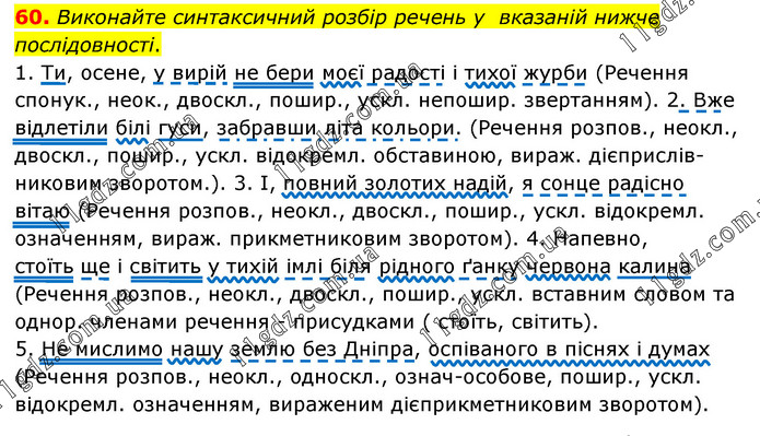 Виконайте синтаксичний розбір речень у вказаній нижче послідовності. 1. Ти, осене, у вирій не бери моєї радості і тихої журби (Речення спонук., неок., двоскл., пошир., ускл. непошир. звертанням). 2. Вже відлетіли білі гуси, забравши літа кольори. (Речення розпов., неокл., двоскл., пошир., ускл. відокремл. обставиною, вираж. дієприслів-никовим зворотом.). 3. І, повний золотих надій, я сонце радісно вітаю (Речення розпов., неокл., двоскл., пошир., ускл. відокремл. означенням, вираж. прикметниковим зворотом). 4. Напевно, стоїть ще і світить у тихій імлі біля рідного ґанку червона калина (Речення розпов., неокл., двоскл., пошир., ускл. вставним словом та однор. членами речення - присудками ( стоїть, світить). 5. Не мислимо нашу землю без Дніпра, оспіваного в піснях і думах (Речення розпов., неокл., односкл., означ-особове, пошир., ускл. відокремл. означенням, вираженим дієприкметниковим зворотом).