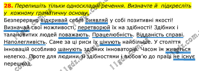 Перепишіть тільки односкладні речення. Визначте й підкресліть у кожному граматичну основу. Безперервно відкривай себе! Виявляй у собі позитивні якості! Визначай свої можливості, перетворюй їх на здібності! Здібних і талановитих людей поважають. Працелюбність. Відданість справі. Наполегливість. Саме за ці риси їх цінують найбільше. У століття інновацій особливо шанують здібних інноваторів. Часом їм живеться нелегко. Проте для людини зі здібностями і любов’ю до праці не існує перешкод.