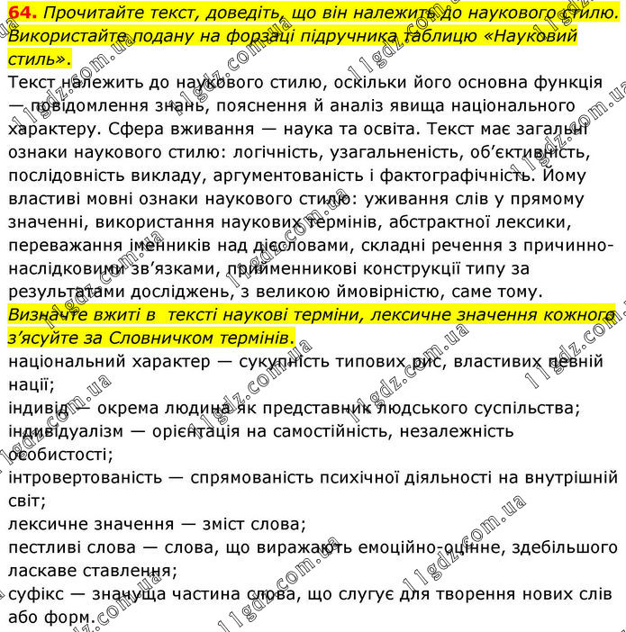 64. Прочитайте текст, доведіть, що він належить до наукового стилю. Використайте подану на форзаці підручника таблицю «Науковий стиль». Текст належить до наукового стилю, оскільки його основна функція — повідомлення знань, пояснення й аналіз явища національного характеру. Сфера вживання — наука та освіта. Текст має загальні ознаки наукового стилю: логічність, узагальненість, об’єктивність, послідовність викладу, аргументованість і фактографічність. Йому властиві мовні ознаки наукового стилю: уживання слів у прямому значенні, використання наукових термінів, абстрактної лексики, переважання іменників над дієсловами, складні речення з причинно-наслідковими зв’язками, прийменникові конструкції типу за результатами досліджень, з великою ймовірністю, саме тому. Визначте вжиті в тексті наукові терміни, лексичне значення кожного з’ясуйте за Словничком термінів. національний характер — сукупність типових рис, властивих певній нації; індивід — окрема людина як представник людського суспільства; індивідуалізм — орієнтація на самостійність, незалежність особистості; інтровертованість — спрямованість психічної діяльності на внутрішній світ; лексичне значення — зміст слова; пестливі слова — слова, що виражають емоційно-оцінне, здебільшого ласкаве ставлення; суфікс — значуща частина слова, що слугує для творення нових слів або форм.