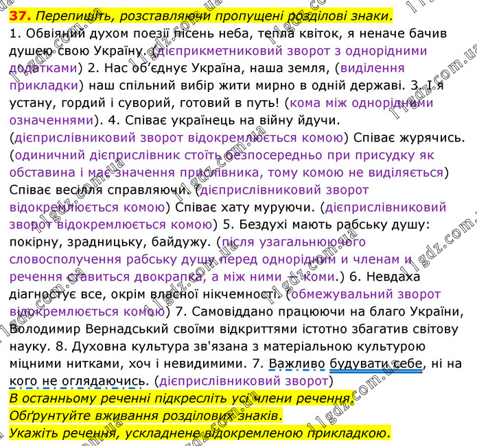 Перепишіть, розставляючи пропущені розділові знаки. 1. Обвіяний духом поезії пісень неба, тепла квіток, я неначе бачив душею свою Україну. (дієприкметниковий зворот з однорідними додатками) 2. Нас об’єднує Україна, наша земля, (виділення прикладки) наш спільний вибір жити мирно в одній державі. 3. І я устану, гордий і суворий, готовий в путь! (кома між однорідними означеннями). 4. Співає українець на війну йдучи. (дієприслівниковий зворот відокремлюється комою) Співає журячись. (одиничний дієприслівник стоїть безпосередньо при присудку як обставина і має значення прислівника, тому комою не виділяється) Співає весілля справляючи. (дієприслівниковий зворот відокремлюється комою) Співає хату муруючи. (дієприслівниковий зворот відокремлюється комою) 5. Бездухі мають рабську душу: покірну, зрадницьку, байдужу. (після узагальнюючого словосполучення рабську душу перед однорідним и членам и речення ставиться двокрапка, а між ними — коми.) 6. Невдаха діагностує все, окрім власної нікчемності. (обмежувальний зворот відокремлюється комою) 7. Самовіддано працюючи на благо України, Володимир Вернадський своїми відкриттями істотно збагатив світову науку. 8. Духовна культура зв'язана з матеріальною культурою міцними нитками, хоч і невидимими. 7. Важливо будувати себе, ні на кого не оглядаючись. (дієприслівниковий зворот) В останньому реченні підкресліть усі члени речення. Обґрунтуйте вживання розділових знаків. Укажіть речення, ускладнене відокремленою прикладкою.