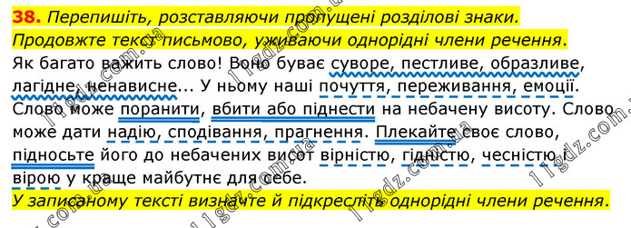Перепишіть, розставляючи пропущені розділові знаки. Продовжте текст письмово, уживаючи однорідні члени речення. Як багато важить слово! Воно буває суворе, пестливе, образливе, лагідне, ненависне... У ньому наші почуття, переживання, емоції. Слово може поранити, вбити або піднести на небачену висоту. Слово може дати надію, сподівання, прагнення. Плекайте своє слово, підносьте його до небачених висот вірністю, гідністю, чесністю і вірою у краще майбутнє для себе. У записаному тексті визначте й підкресліть однорідні члени речення.