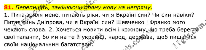 Перепишіть, замінюючи пряму мову на непряму. 1. Пита земля мене, питають ріки, чи я Вкраїні син? Чи син навіки? Питає синь Дніпрова, чи я Вкраїні син? Шевченко і Франко мого чекають слова. 2. Хочеться мовити всім і кожному, що треба берегти свої таланти, бо ми на те й українці, народ, держава, щоб пишатися своїм національним багатством.