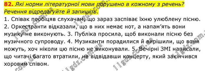 Які норми літературної мови порушено в кожному з речень? Речення відредагуйте й запишіть. 1. Співак пообіцяв слухачам, що зараз заспіває їхню улюблену пісню. 2. Оркестранти відказали, що в них немає нот, а напам’ять вони музику не виконують. 3. Публіка просила, щоб виконали пісню без музичного супроводу. 4. Музиканти порадилися й вирішили, що вони можуть, хоч ніколи цю пісню не виконували. 5. Вечірні ЗМІ написали, що читачі багато втратили, не відвідавши концерту, який закінчився хоровим співом.
