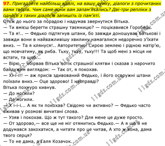 Пригадайте найбільш вдалі, на вашу думку, діалоги з прочитаних вами творів. Чим саме вони вам запам’ятались? Дві-три репліки з одного з таких діалогів запишіть із пам’яті. Отож до нього за порадою і надумав звернутися Вітька. — Ти вмієш берегти страшну таємницю? — поцікавився Горобець. — Та я!.. — Федько підтягнув штани, бо завжди доношував батькові і завжди вони в найважливішу хвилину намагалися недоречно з’їхати вниз. — Та я клянуся!.. Авторитетно! Сирою землею і рідною матір’ю, що мовчатиму, як риба. Тьху, тьху, тьху!!! Та щоб мені з місця не встати, та щоб... — Вірю,— обірвав Вітька потік страшної клятви і сказав з нарочито байдужим виглядом: — Так от, я покохав. — Хі-і-і!! — аж присів здивований Федько, і його осоружні штани поїхали вниз.— Оце здорово! І насправді? Вітька похмуро кивнув. — До могили? — До могили. — Х і-і-і... А як ти покохав? Свідомо чи активно? — Федько часто вживав у розмові вичитані слова. — Узяв і покохав. Що ж тут такого? Для мене це дуже просто. — От здорово,— все ще не міг отямитись Федько.— А я ще й не додумався закохатися, а читати про це читав, А хто ж вона, дама твого серця? — То не дама, а Галя Козачок.