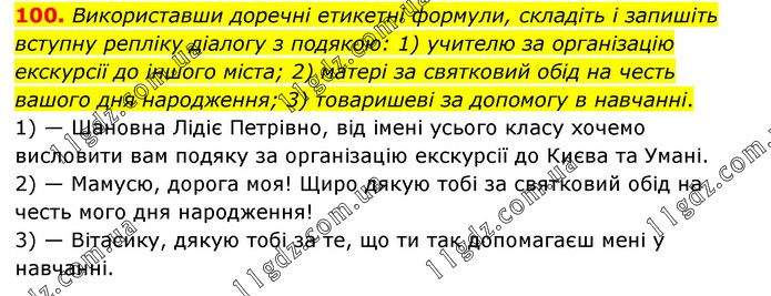 Використавши доречні етикетні формули, складіть і запишіть вступну репліку діалогу з подякою: 1) учителю за організацію екскурсії до іншого міста; 2) матері за святковий обід на честь вашого дня народження; 3) товаришеві за допомогу в навчанні. 1) — Шановна Лідіє Петрівно, від імені усього класу хочемо висловити вам подяку за організацію екскурсії до Києва та Умані. 2) — Мамусю, дорога моя! Щиро дякую тобі за святковий обід на честь мого дня народження! 3) — Вітасику, дякую тобі за те, що ти так допомагаєш мені у навчанні.
