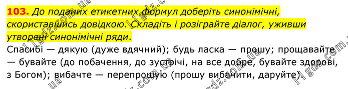 До поданих етикетних формул доберіть синонімічні, скориставшись довідкою. Складіть і розіграйте діалог, уживши утворені синонімічні ряди. Спасибі — дякую (дуже вдячний); будь ласка — прошу; прощавайте — бувайте (до побачення, до зустрічі, на все добре, бувайте здорові, з Богом); вибачте — перепрошую (прошу вибачити, даруйте).