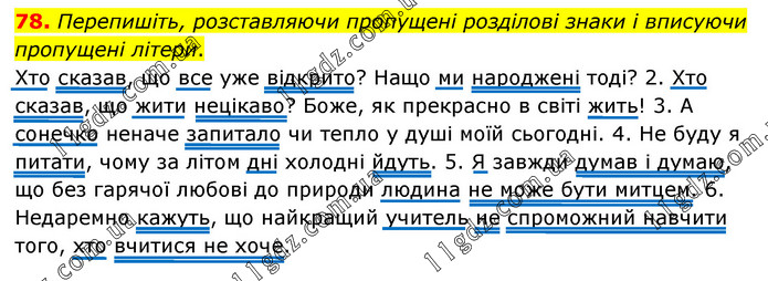 Перепишіть, розставляючи пропущені розділові знаки і вписуючи пропущені літери. Хто сказав, що все уже відкрито? Нащо ми народжені тоді? 2. Хто сказав, що жити нецікаво? Боже, як прекрасно в світі жить! 3. А сонечко неначе запитало чи тепло у душі моїй сьогодні. 4. Не буду я питати, чому за літом дні холодні йдуть. 5. Я завжди думав і думаю, що без гарячої любові до природи людина не може бути митцем. 6. Недаремно кажуть, що найкращий учитель не спроможний навчити того, хто вчитися не хоче.