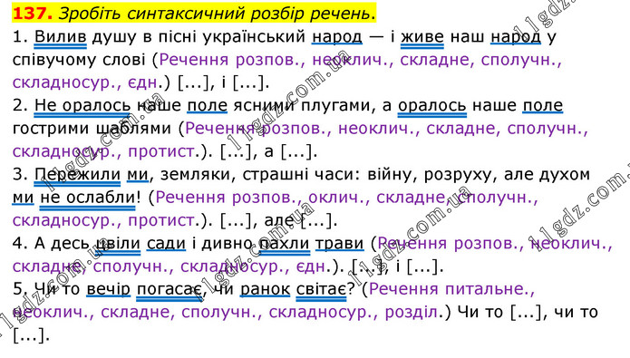 Зробіть синтаксичний розбір речень. 1. Вилив душу в пісні український народ — і живе наш народ у співучому слові (Речення розпов., неоклич., складне, сполучн., складносур., єдн.) [...], і [...]. 2. Не оралось наше поле ясними плугами, а оралось наше поле гострими шаблями (Речення розпов., неоклич., складне, сполучн., складносур., протист.). [...], а [...]. 3. Пережили ми, земляки, страшні часи: війну, розруху, але духом ми не ослабли! (Речення розпов., оклич., складне, сполучн., складносур., протист.). [...], але [...]. 4. А десь цвіли сади і дивно пахли трави (Речення розпов., неоклич., складне, сполучн., складносур., єдн.). [...], і [...]. 5. Чи то вечір погасає, чи ранок світає? (Речення питальне., неоклич., складне, сполучн., складносур., розділ.) Чи то [...], чи то [...].