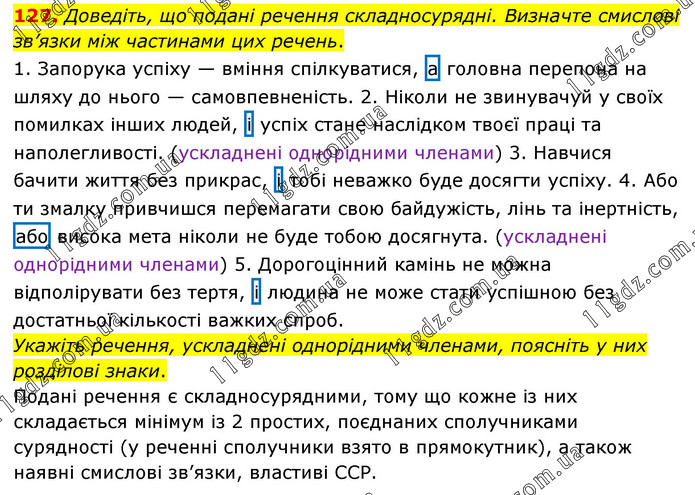 Доведіть, що подані речення складносурядні. Визначте смислові зв’язки між частинами цих речень. 1. Запорука успіху — вміння спілкуватися, а головна перепона на шляху до нього — самовпевненість. 2. Ніколи не звинувачуй у своїх помилках інших людей, і успіх стане наслідком твоєї праці та наполегливості. (ускладнені однорідними членами) 3. Навчися бачити життя без прикрас, і тобі неважко буде досягти успіху. 4. Або ти змалку привчишся перемагати свою байдужість, лінь та інертність, або висока мета ніколи не буде тобою досягнута. (ускладнені однорідними членами) 5. Дорогоцінний камінь не можна відполірувати без тертя, і людина не може стати успішною без достатньої кількості важких спроб. Укажіть речення, ускладнені однорідними членами, поясніть у них розділові знаки. Подані речення є складносурядними, тому що кожне із них складається мінімум із 2 простих, поєднаних сполучниками сурядності (у реченні сполучники взято в прямокутник), а також наявні смислові зв’язки, властиві ССР.