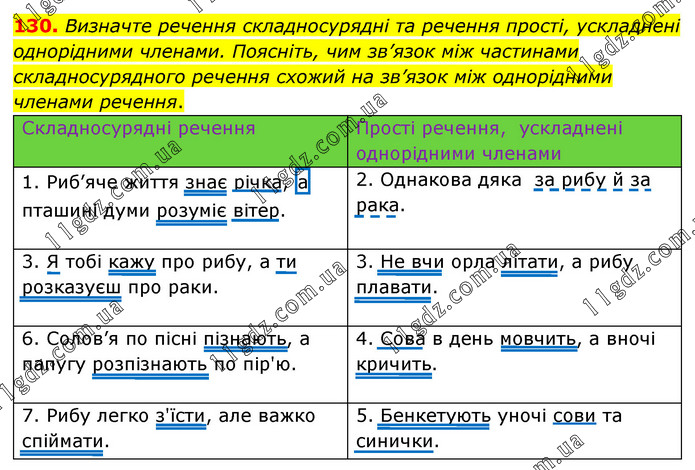 Визначте речення складносурядні та речення прості, ускладнені однорідними членами. Поясніть, чим зв’язок між частинами складносурядного речення схожий на зв’язок між однорідними членами речення. Складносурядні речення Прості речення, ускладнені однорідними членами 1. Риб’яче життя знає річка, а пташині думи розуміє вітер. 2. Однакова дяка за рибу й за рака. 3. Я тобі кажу про рибу, а ти розказуєш про раки. 3. Не вчи орла літати, а рибу плавати. 6. Солов’я по пісні пізнають, а папугу розпізнають по пір'ю. 4. Сова в день мовчить, а вночі кричить. 7. Рибу легко з'їсти, але важко спіймати. 5. Бенкетують уночі сови та синички.