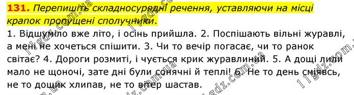 Перепишіть cкладносурядні речення, уставляючи на місці крапок пропущені сполучники. 1. Відшуміло вже літо, і осінь прийшла. 2. Поспішають вільні журавлі, а мені не хочеться спішити. 3. Чи то вечір погасає, чи то ранок світає? 4. Дороги розмиті, і чується крик журавлиний. 5. А дощі лили мало не щоночі, зате дні були сонячні й теплі! 6. Не то день сміявсь, не то дощик хлипав, не то вітер шастав.