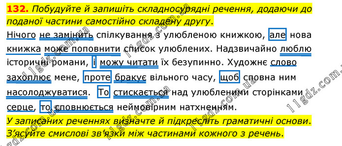 Побудуйте й запишіть складносурядні речення, додаючи до поданої частини самостійно складену другу. Нічого не замінить спілкування з улюбленою книжкою, але нова книжка може поповнити список улюблених. Надзвичайно люблю історичні романи, і можу читати їх безупинно. Художнє слово захоплює мене, проте бракує вільного часу, щоб сповна ним насолоджуватися. То стискається над улюбленими сторінками серце, то сповнюється неймовірним натхненням. У записаних реченнях визначте й підкресліть граматичні основи. З’ясуйте смислові зв’язки між частинами кожного з речень.