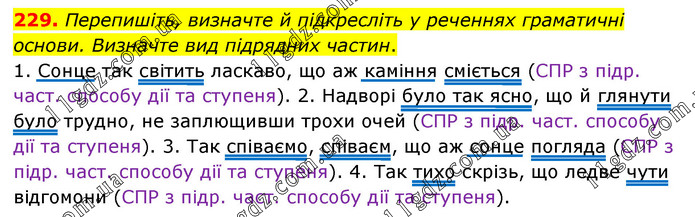 Перепишіть, визначте й підкресліть у реченнях граматичні основи. Визначте вид підрядних частин. 1. Сонце так світить ласкаво, що аж каміння сміється (СПР з підр. част. способу дії та ступеня). 2. Надворі було так ясно, що й глянути було трудно, не заплющивши трохи очей (СПР з підр. част. способу дії та ступеня). 3. Так співаємо, співаєм, що аж сонце погляда (СПР з підр. част. способу дії та ступеня). 4. Так тихо скрізь, що ледве чути відгомони (СПР з підр. част. способу дії та ступеня).