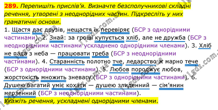 Перепишіть прислів’я. Визначте безсполучникові складні речення, утворені з неоднорідних частин. Підкресліть у них граматичні основи. 1. Щастя дає друзів, нещастя їх перевіряє (БСР з однорідними частинами). 2. Знай: за гроші купується хліб, але не дружба (БСР з неоднорідними частинами ускладнено однорідними членами). 3. Хліб не пада з неба — працювати треба (БСР з неоднорідними частинами). 4. Старанність полотно тче, ледарство ж марно тече (БСР з однорідними частинами). 5. Любов породжує любов, жорстокість множить зневагу (БСР з однорідними частинами). 6. Душею багатий уміє кохати — душею злиденний — сім’янин мерзенний (БСР з неоднорідними частинами). Укажіть речення, ускладнені однорідними членами.