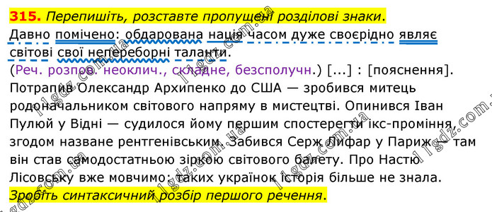 Перепишіть, розставте пропущені розділові знаки. Давно помічено: обдарована нація часом дуже своєрідно являє світові свої непереборні таланти. (Реч. розпов. неоклич., складне, безсполучн.) [...] : [пояснення]. Потрапив Олександр Архипенко до США — зробився митець родоначальником світового напряму в мистецтві. Опинився Іван Пулюй у Відні — судилося йому першим спостерегти ікс-проміння, згодом назване рентгенівським. Забився Серж Лифар у Париж — там він став самодостатньою зіркою світового балету. Про Настю Лісовську вже мовчимо: таких українок історія більше не знала. Зробіть синтаксичний розбір першого речення.