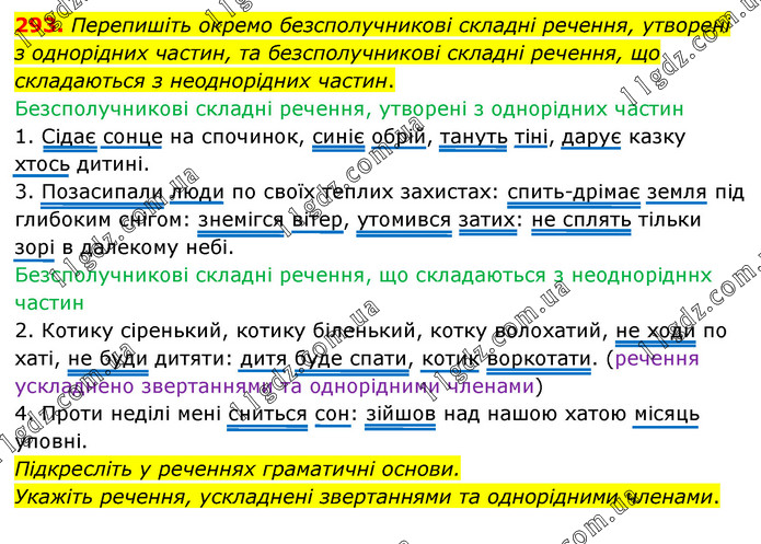 Перепишіть окремо безсполучникові складні речення, утворені з однорідних частин, та безсполучникові складні речення, що складаються з неоднорідних частин. Безсполучникові складні речення, утворені з однорідних частин 1. Сідає сонце на спочинок, синіє обрій, тануть тіні, дарує казку хтось дитині. 3. Позасипали люди по своїх теплих захистах: спить-дрімає земля під глибоким снігом: знемігся вітер, утомився затих: не сплять тільки зорі в далекому небі. Безсполучникові складні речення, що складаються з неоднорідннх частин 2. Котику сіренький, котику біленький, котку волохатий, не ходи по хаті, не буди дитяти: дитя буде спати, котик воркотати. (речення ускладнено звертаннями та однорідними членами) 4. Проти неділі мені сниться сон: зійшов над нашою хатою місяць уповні. Підкресліть у реченнях граматичні основи. Укажіть речення, ускладнені звертаннями та однорідними членами.