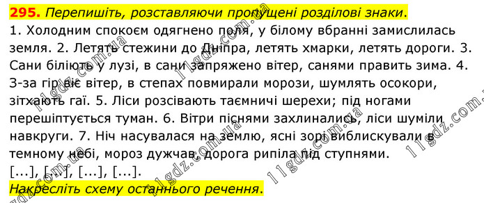 Перепишіть, розставляючи пропущені розділові знаки. 1. Холодним спокоєм одягнено поля, у білому вбранні замислилась земля. 2. Летять стежини до Дніпра, летять хмарки, летять дороги. 3. Сани біліють у лузі, в сани запряжено вітер, санями править зима. 4. З-за гір віє вітер, в степах повмирали морози, шумлять осокори, зітхають гаї. 5. Ліси розсівають таємничі шерехи; під ногами перешіптується туман. 6. Вітри піснями захлинались, ліси шуміли навкруги. 7. Ніч насувалася на землю, ясні зорі виблискували в темному небі, мороз дужчав, дорога рипіла під ступнями. [...], [...], [...], [...]. Накресліть схему останнього речення.