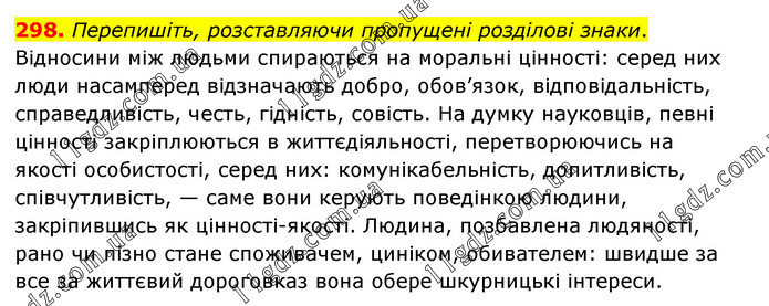 Перепишіть, розставляючи пропущені розділові знаки. Відносини між людьми спираються на моральні цінності: серед них люди насамперед відзначають добро, обов’язок, відповідальність, справедливість, честь, гідність, совість. На думку науковців, певні цінності закріплюються в життєдіяльності, перетворюючись на якості особистості, серед них: комунікабельність, допитливість, співчутливість, — саме вони керують поведінкою людини, закріпившись як цінності-якості. Людина, позбавлена людяності, рано чи пізно стане споживачем, циніком, обивателем: швидше за все за життєвий дороговказ вона обере шкурницькі інтереси.
