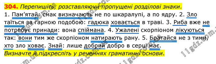 Перепишіть, розставляючи пропущені розділові знаки. 1. Пам’ятай: смак визначають не по шкаралупі, а по ядру. 2. Зло таїться за гарною подобою: гадюка ховається в траві. 3. Риба вже не потребує принади: вона спіймана. 4. Ужалені скорпіоном лікуються так: вони тим же скорпіоном натирають рану. 5. Братайся не з тими, хто зло ховає. Знай: лише добрий добро в серці має. Визначте й підкресліть у реченнях граматичні основи.