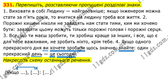 Перепишіть, розставляючи пропущені розділові знаки. 1. Виховати в собі Людину — найголовніше; якщо інженером можна стати за п’ять років, то вчитися на людину треба все життя. 2. Порожні кишені ніколи не завадять нам стати тими, ким ми хочемо бути: завадити цьому можуть тільки порожні голови і порожні серця. 3. Все, що ти маєш зробити, ти зробиш краще за інших, і все, що є для тебе важливим, не зробить ніхто, крім тебе. 4. Якщо одного прекрасного дня ви хочете зробити щось значне, знайте: один прекрасний день — це сьогодні. Накресліть схему останнього речення. (Якщо ...), [...]: [...].