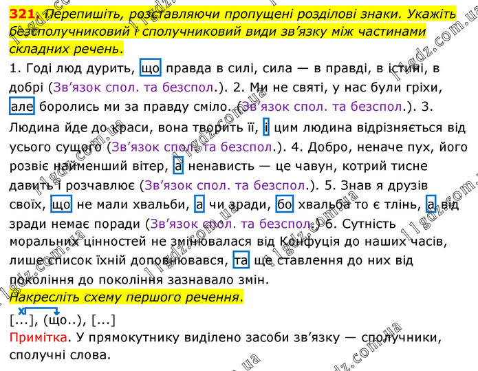 Перепишіть, розставляючи пропущені розділові знаки. Укажіть безсполучниковий і сполучниковий види зв’язку між частинами складних речень. 1. Годі люд дурить, що правда в силі, сила — в правді, в істині, в добрі (Зв’язок спол. та безспол.). 2. Ми не святі, у нас були гріхи, але боролись ми за правду сміло. (Зв’язок спол. та безспол.). 3. Людина йде до краси, вона творить її, і цим людина відрізняється від усього сущого (Зв’язок спол. та безспол.). 4. Добро, неначе пух, його розвіє найменший вітер, а ненависть — це чавун, котрий тисне давить і розчавлює (Зв’язок спол. та безспол.). 5. Знав я друзів своїх, що не мали хвальби, а чи зради, бо хвальба то є тлінь, а від зради немає поради (Зв’язок спол. та безспол.) 6. Сутність моральних цінностей не змінювалася від Конфуція до наших часів, лише список їхній доповнювався, та ще ставлення до них від покоління до покоління зазнавало змін. Накресліть схему першого речення. [...], (що..), [...] Примітка. У прямокутнику виділено засоби зв’язку — сполучники, сполучні слова.