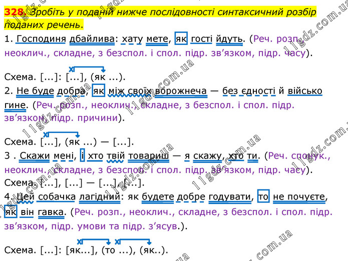 Зробіть у поданій нижче послідовності синтаксичний розбір поданих речень. 1. Господиня дбайлива: хату мете, як гості йдуть. (Реч. розп., неоклич., складне, з безспол. і спол. підр. зв’язком, підр. часу). Схема. [...]: [...], (як ...). 2. Не буде добра, як між своїх ворожнеча — без єдності й військо гине. (Реч. розп., неоклич., складне, з безспол. і спол. підр. зв’язком, підр. причини). Схема. [...], (як ...) — [...]. 3 . Скажи мені, і хто твій товариш — я скажу, хто ти. (Реч. спонук., неоклич., складне, з безспол. і спол. підр. зв’язком, підр. часу). Схема. [...], [...] — [...], [...]. 4. Цей собачка лагідний: як будете добре годувати, то не почуєте, як він гавка. (Реч. розп., неоклич., складне, з безспол. і спол. підр. зв’язком, підр. умови та підр. з’ясув.). Схема. [...]: [як...], (то ...), (як..).