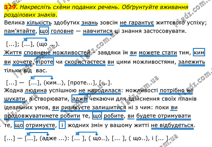 Накресліть схеми поданих речень. Обґрунтуйте вживання розділових знаків. Велика кількість здобутих знань зовсім не гарантує життєвого успіху; пам’ятайте, що головне — навчитися ці знання застосовувати. [...]; [...], (що ...). Життя сповнене можливостей – завдяки їм ви можете стати тим, ким ви хочете, проте чи скористаєтеся ви цими можливостями, залежить тільки від вас. [...] — [...], (ким…), [проте...], [...]. Жодна людина успішною не народилася: можливості потрібно не шукати, а створювати, адже чекаючи для здійснення своїх планів ідеальних умов, ви ризикуєте залишитися ні з чим: поки ви продовжуватимете робити те, що робите, ви будете отримувати те, що отримуєте, і жодних змін у вашому житті не відбудеться. [...] — [...], (адже ...): [... ], ( що..), [... ], ( що..), і [... ].