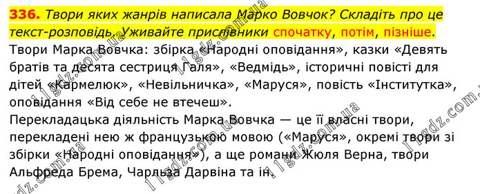 Твори яких жанрів написала Марко Вовчок? Складіть про це текст-розповідь. Уживайте прислівники спочатку, потім, пізніше. Твори Марка Вовчка: збірка «Народні оповідання», казки «Девять братів та десята сестриця Галя», «Ведмідь», історичні повісті для дітей «Кармелюк», «Невільничка», «Маруся», повість «Інститутка», оповідання «Від себе не втечеш». Перекладацька діяльність Марка Вовчка — це її власні твори, перекладені нею ж французькою мовою («Маруся», окремі твори зі збірки «Народні оповідання»), а ще романи Жюля Верна, твори Альфреда Брема, Чарльза Дарвіна та ін.