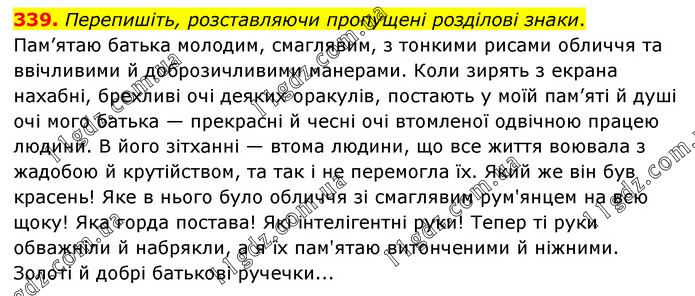 Перепишіть, розставляючи пропущені розділові знаки. Пам’ятаю батька молодим, смаглявим, з тонкими рисами обличчя та ввічливими й доброзичливими манерами. Коли зирять з екрана нахабні, брехливі очі деяких оракулів, постають у моїй пам’яті й душі очі мого батька — прекрасні й чесні очі втомленої одвічною працею людини. В його зітханні — втома людини, що все життя воювала з жадобою й крутійством, та так і не перемогла їх. Який же він був красень! Яке в нього було обличчя зі смаглявим рум'янцем на всю щоку! Яка горда постава! Які інтелігентні руки! Тепер ті руки обважніли й набрякли, а я їх пам'ятаю витонченими й ніжними. Золоті й добрі батькові ручечки...
