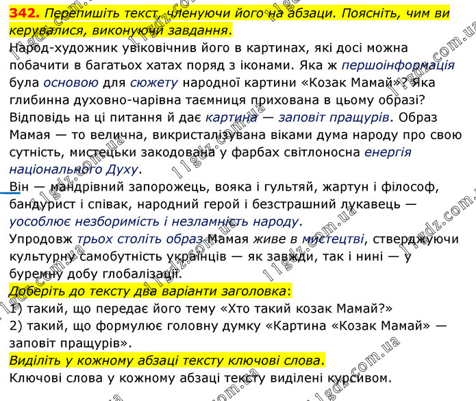 Перепишіть текст, членуючи його на абзаци. Поясніть, чим ви керувалися, виконуючи завдання. Народ-художник увіковічнив його в картинах, які досі можна побачити в багатьох хатах поряд з іконами. Яка ж першоінформація була основою для сюжету народної картини «Козак Мамай»? Яка глибинна духовно-чарівна таємниця прихована в цьому образі? Відповідь на ці питання й дає картина — заповіт пращурів. Образ Мамая — то велична, викристалізувана віками дума народу про свою сутність, мистецьки закодована у фарбах світлоносна енергія національного Духу. Він — мандрівний запорожець, вояка і гультяй, жартун і філософ, бандурист і співак, народний герой і безстрашний лукавець — уособлює незборимість і незламність народу. Упродовж трьох століть образ Мамая живе в мистецтві, стверджуючи культурну самобутність українців — як завжди, так і нині — у буремну добу глобалізації. Доберіть до тексту два варіанти заголовка: 1) такий, що передає його тему «Хто такий козак Мамай?» 2) такий, що формулює головну думку «Картина «Козак Мамай» — заповіт пращурів». Виділіть у кожному абзаці тексту ключові слова. Ключові слова у кожному абзаці тексту виділені курсивом.