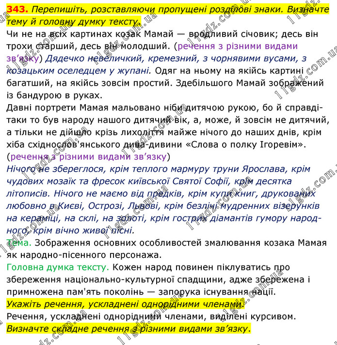 Перепишіть, розставляючи пропущені розділові знаки. Визначте тему й головну думку тексту. Чи не на всіх картинах козак Мамай — вродливий січовик; десь він трохи старший, десь він молодший. (речення з різними видами зв’язку) Дядечко невеличкий, кремезний, з чорнявими вусами, з козацьким оселедцем у жупані. Одяг на ньому на якійсь картині багатший, на якійсь зовсім простий. Здебільшого Мамай зображений із бандурою в руках. Давні портрети Мамая мальовано ніби дитячою рукою, бо й справді-таки то був народу нашого дитячий вік, а, може, й зовсім не дитячий, а тільки не дійшло крізь лихоліття майже нічого до наших днів, крім хіба східнослов'янського дива-дивини «Слова о полку Ігоревім». (речення з різними видами зв’язку) Нічого не збереглося, крім теплого мармуру труни Ярослава, крім чудових мозаїк та фресок київської Святої Софії, крім десятка літописів. Нічого не маємо від предків, крім купи книг, друкованих любовно в Києві, Острозі, Львові, крім безлічі мудренних візерунків на кераміці, на склі, на золоті, крім гострих діамантів гумору народ-ного, крім вічно живої пісні. Тема. Зображення основних особливостей змалювання козака Мамая як народно-пісенного персонажа. Головна думка тексту. Кожен народ повинен піклуватись про збереження національно-культурної спадщини, адже збережена і примножена пам'ять поколінь — запорука існування нації. Укажіть речення, ускладнені однорідними членами. Речення, ускладнені однорідними членами, виділені курсивом. Визначте складне речення з різними видами зв’язку.