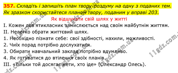 Складіть і запишіть план твору-роздуму на одну з поданих тем. Як зразком скористайтеся планом твору, поданим у вправі 203. Як відшукати свій шлях у житті I. Кожен дев’ятикласник замислюється над своїм майбутнім життям. II. Нелегко обрати життєвий шлях. 1. Необхідно пізнати себе: свої здібності, нахили, можливості. 2. Чиїх порад потрібно дослухатися. 3. Обирати навчальний заклад потрібно вдумливо. 4. Як готуватися до втілення своїх планів. III. «Тільки той досягає мети, хто іде» (Олександр Олесь).