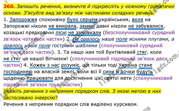 Запишіть речення, визначте й підкресліть у кожному граматичні основи. З’ясуйте вид зв’язку між частинами складних речень. 1. Запорожжя споконвіку було серцем українським, воля на Запорожжі ніколи не вмирала, звичаї давні ніколи не забувалися, козацькі предковічні пісні не замовкали (безсполучниковий сурядний зв'язок чотирьох частин) 2. Не оралось наше поле ясними плугами, а оралось наше поле гострими шаблями (сполучниковий сурядний зв’язок двох частин). 3. Та нащо нам той бунтівливий стяг, коли не стяг це нашої Вітчизни! (сполучниковий підрядний зв’язок двох частин) 4. Кожен з нас розуміє, що тільки тоді Україна стане господинею на власній землі, коли всі її сини й дочки будуть щоденно працювати для досягнення цієї святої мети (сполучниковий підрядний зв'язок трьох частин) Укажіть речення з непрямим порядком слів. З якою метою в них застосовано інверсію? Речення з непрямим порядком слів виділено курсивом.