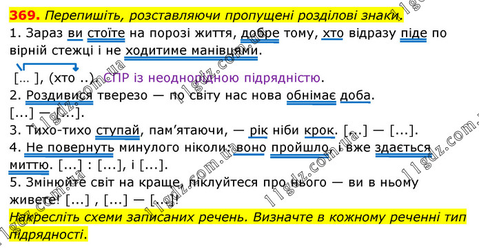 Перепишіть, розставляючи пропущені розділові знаки. 1. Зараз ви стоїте на порозі життя, добре тому, хто відразу піде по вірній стежці і не ходитиме манівцями. [… ], (хто ..). СПР із неоднорідною підрядністю. 2. Роздивися тверезо — по світу нас нова обнімає доба. [...] — [...]. 3. Тихо-тихо ступай, пам’ятаючи, — рік ніби крок. [...] — [...]. 4. Не повернуть минулого ніколи: воно пройшло, і вже здається миттю. [...] : [...], і [...]. 5. Змінюйте світ на краще, піклуйтеся про нього — ви в ньому живете! [...] , [...] — [...]! Накресліть схеми записаних речень. Визначте в кожному реченні тип підрядності.