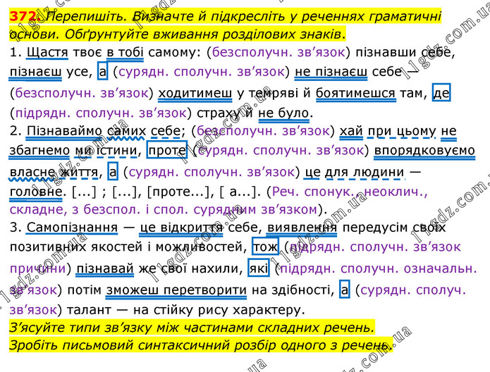 Перепишіть. Визначте й підкресліть у реченнях граматичні основи. Обґрунтуйте вживання розділових знаків. 1. Щастя твоє в тобі самому: (безсполучн. зв’язок) пізнавши себе, пізнаєш усе, а (сурядн. сполучн. зв’язок) не пізнаєш себе — (безсполучн. зв’язок) ходитимеш у темряві й боятимешся там, де (підрядн. сполучн. зв’язок) страху й не було. 2. Пізнаваймо самих себе; (безсполучн. зв’язок) хай при цьому не збагнемо ми істини, проте (сурядн. сполучн. зв’язок) впорядковуємо власне життя, а (сурядн. сполучн. зв’язок) це для людини — головне. [...] ; [...], [проте...], [ а...]. (Реч. спонук., неоклич., складне, з безспол. і спол. сурядним зв’язком). 3. Самопізнання — це відкриття себе, виявлення передусім своїх позитивних якостей і можливостей, тож (підрядн. сполучн. зв’язок причини) пізнавай же свої нахили, які (підрядн. сполучн. означальн. зв’язок) потім зможеш перетворити на здібності, а (сурядн. сполуч. зв’язок) талант — на стійку рису характеру. З’ясуйте типи зв’язку між частинами складних речень. Зробіть письмовий синтаксичний розбір одного з речень.