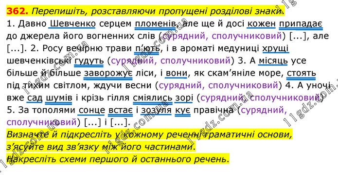 Перепишіть, розставляючи пропущені розділові знаки. 1. Давно Шевченко серцем пломенів, але ще й досі кожен припадає до джерела його вогненних слів (сурядний, сполучниковий) [...], але [...]. 2. Росу вечірню трави п’ють, і в ароматі медуниці хрущі шевченківські гудуть (сурядний, сполучниковий) 3. А місяць усе більше й більше заворожує ліси, і вони, як скам’яніле море, стоять під тихим світлом, ждучи весни (сурядний, сполучниковий) 4. А уночі вже сад шумів і крізь гілля сміялись зорі (сурядний, сполучниковий) 5. За тополями сонце встає і зозуля кує правічна (сурядний, сполучниковий) [...] і [...]. Визначте й підкресліть у кожному реченні граматичні основи, з’ясуйте вид зв’язку між його частинами. Накресліть схеми першого й останнього речень.