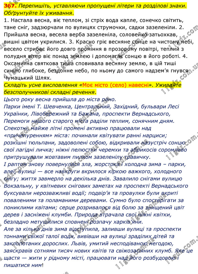 Перепишіть, уставляючи пропущені літери та розділові знаки. Обґрунтуйте їх уживання. 1. Настала весна, віє теплом, зі стріх вода капле, сонечко світить, тане сніг, задзюрчали по вулицях струмочки, садки зазеленіли. 2. Прийшла весна, весела верба зазеленіла, соловейко затьохкав, вишні цвітом укрилися. 3. Красно гріє весняне сонце на чистому небі, весело стрибає його довго проміння в прозорому повітрі, теплий з полудня вітер віє понад землею і допомагає сонцю в його роботі. 4. Оксамитна святкова тиша сповивала весняну землю, в цій тиші синіло глибоке, бездонне небо, по ньому до самого надзем’я гнувся Чумацький Шлях. Складіть усне висловлення «Моє місто (село) навесні». Уживайте безсполучникові складні речення. Цього року весна прийшла до міста рано. Парки імені Т. Шевченка, Центральний, Західний, бульвари Лесі Українки, Лівобережний та Бажана, проспекти Вернадського, Перемоги нашого старого міста раділи теплим, сонячним дням. Спекотні, майже літні промені активно працювали над «причепуренням» міста: починали квітувати ранні нарциси; розкішні тюльпани, задоволені собою, відкривали назустріч сонцю свої лагідні личка; ніжні пелюстки черемхи та абрикосів соромливо притрушували жовтавим пилком зазеленілу травичку. І раптом знову повернулася зла, жорстока і холодна зима – парки, алеї, вулиці — все навкруги вкрилося кіркою важкого, холодного снігу; життя завмерло на декілька днів. Завалило снігами вулицю Вокзальну, у квітневих снігових заметах на проспекті Вернадського буксували нерозважливі водії; подвір’я та провулки були вкриті поваленими та поламаними деревами. Сумно було спостерігати за пониклими квітами; серце розривалося від болю за знищений цвіт дерев і засніжені клумби. Природа втрачала свої ніжні квітки, безладно метушилися сповнені розпачу харків’яни. Але за кілька днів зима відступила, заливши вулиці та проспекти тоннами свіжої талої води, вивівши на вулиці зраділих дітей та заклопотаних дорослих. Львів, умитий несподіваною негодою, заяскравів сотнями тисяч нових квітів та свіжозасіяних клумб. Яке це щастя — жити у рідному місті, працювати над його розбудовою і пишатися ним!