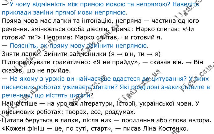 — У чому відмінність між прямою мовою та непрямою? Наведіть приклади заміни прямої мови непрямою. Пряма мова має лапки та інтонацію, непряма — частина одного речення, змінюється особа дієслів. Пряма: Марко спитав: «Чи готовий ти?» Непряма: Марко спитав, чи готовий я. — Поясніть, як пряму мову замінити непрямою. Зняти лапки. Змінити займенники (я → він, ти → я) Підпорядкувати граматично: «Я не прийду», — сказав він. → Він сказав, що не прийде. — На якому з уроків ви найчастіше вдаєтеся до цитування? У яких письмових роботах уживаєте цитати? Які розділові знаки ставите в реченнях, що містять цитати? Найчастіше — на уроках літератури, історії, української мови. У письмових роботах: творах, есе, роздумах. Цитати беруться в лапки, після них — посилання або слова автора. «Кожен фініш — це, по суті, старт», — писав Ліна Костенко.