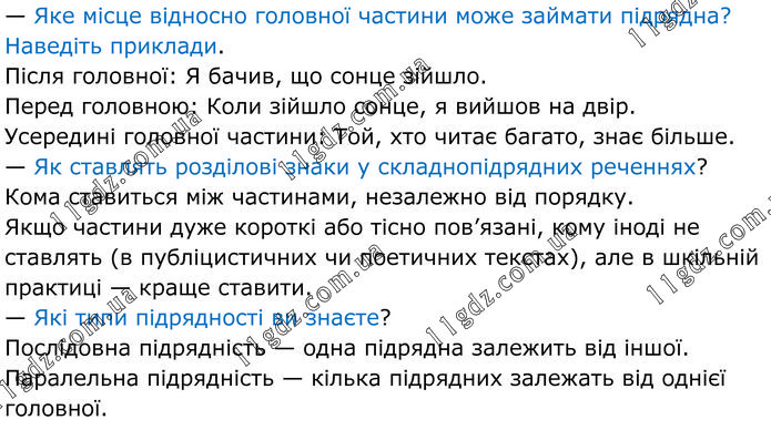 — Яке місце відносно головної частини може займати підрядна? Наведіть приклади. Після головної: Я бачив, що сонце зійшло. Перед головною: Коли зійшло сонце, я вийшов на двір. Усередині головної частини: Той, хто читає багато, знає більше. — Як ставлять розділові знаки у складнопідрядних реченнях? Кома ставиться між частинами, незалежно від порядку. Якщо частини дуже короткі або тісно пов’язані, кому іноді не ставлять (в публіцистичних чи поетичних текстах), але в шкільній практиці — краще ставити. — Які типи підрядності ви знаєте? Послідовна підрядність — одна підрядна залежить від іншої. Паралельна підрядність — кілька підрядних залежать від однієї головної.
